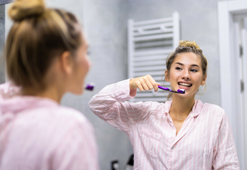 • При утренней тошноте не чистите зубы сразу после рвоты: сначала ополосните рот тёплой водой или раствором соды (0,5 ч.л. на стакан), через 30–60 минут аккуратно почистите.