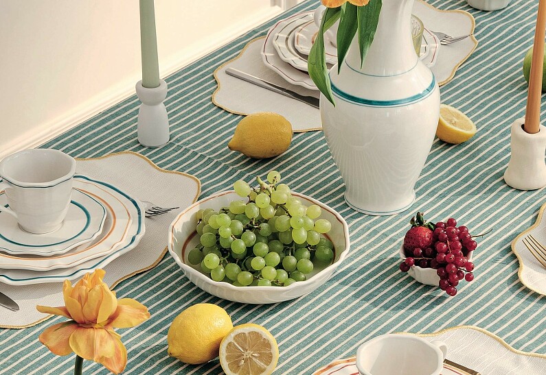 Возьмите за основу светлую базу (например, текстиль и большую часть посуды), которую вы уже будете дополнять акцентами в выбранных оттенках. Такими яркими нотами могут служить бокалы для воды из цветного стекла, сервировочные салфетки и декор — ваза с цветами или сочные фрукты.