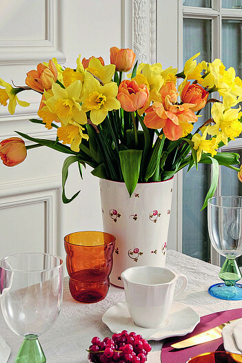 В более игривом варианте возьмите в качестве объединяющего элемента ритмичный орнамент и общую тональность цветов. Полоска в данном случае встречается в основных, «весомых» элементах сервировки — в орнаменте скатерти, канте салфетки и тарелок, в дизайне вазы. Она создает ритм, который поддерживается и в повторяющихся цветах.