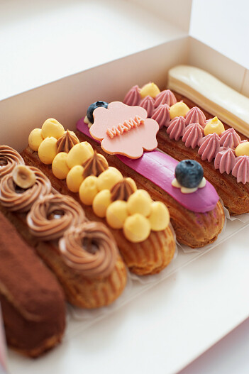 Праздничная коллекция также включает набор изящных эклеров. А дополнить подарок можно сезонным букетом из свежих роз.