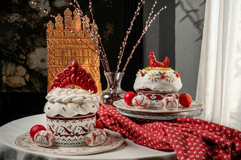 Шеф-кондитер Александр Солонин приготовил два вида куличей ручной работы на сливочном масле. В тесто добавили цедру апельсина, а также вишню и клюкву, вымоченные в апельсиновом соке с коньяком, что придает выпечке насыщенный вкус с цитрусовыми нотами. Украшение можно выбрать: расписная курочка, словно сошедшая со страниц русских сказок, или шоколадный кокошник из традиционного костюма. В состав праздничного набора также входят десять пасхальных яиц с авторской росписью. Всё это упаковано в красивую коробку, которую удобно поставить на стол или подарить.